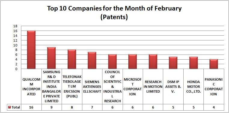 The Indian patent office granted 454 Patents for the month of February, 2014. The Top three consisted of Qualcomm Incorporated, Samsung R& D Institute India Bangalore Private Limited and Telefonaktiebolaget Lm Ericsson (PUBL), with a count of 16, 9 and 8 patents respectively. The table below shows the top ten Companies that received the maximum number of patents for the month of February, 2014.