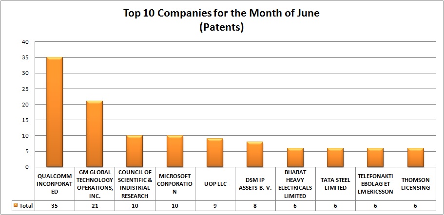 The Indian patent office granted 646 Patents for the month of June, 2014. The Top three consisted of Qualcomm Incorporated, GM Global Technology Operations, Inc and Council of Scientific & Industrial Research with a count of 35, 21 and 10 patents respectively. The table below shows the top ten Companies that received the maximum number of patents for the month of June, 2014.