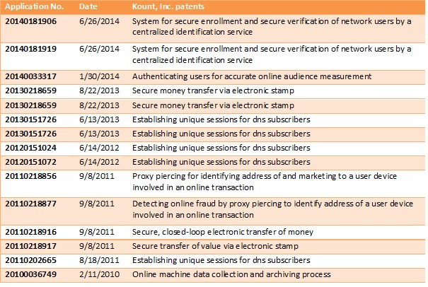 This brings the number of Kount’s issued patents to 18. In April of 2014, Kount was issued U.S. Patent No. 8,701,170, “System for Secure Enrollment and Secure Verification of Network Users by a Centralized Identification Service” and in June was issued a U.S. Patent No. 8,762,574 titled, “Establishing Unique Sessions for DNS Subscribers.”