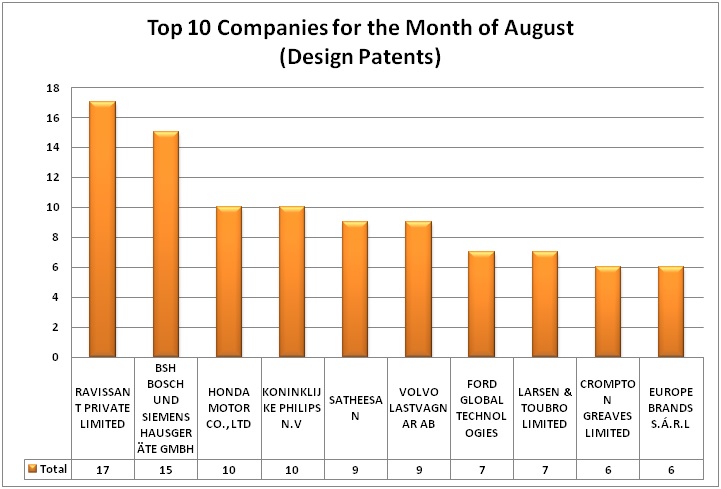 Design Patents Trends –August 2014 ipmetrix / September 14, 2014 The Indian Patent office granted 554 Design patents in the month of August, 2014. The details are tabulated below. Share this: Click to share on X (Opens in new window) X Click to share on Facebook (Opens in new window) Facebook Click to share on LinkedIn (Opens in new window) LinkedIn Click to email a link to a friend (Opens in new window) Email Like Loading...