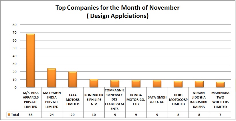 The Indian Patent office granted 614 Design patents in the month of November, 2014. The details are pictured below: